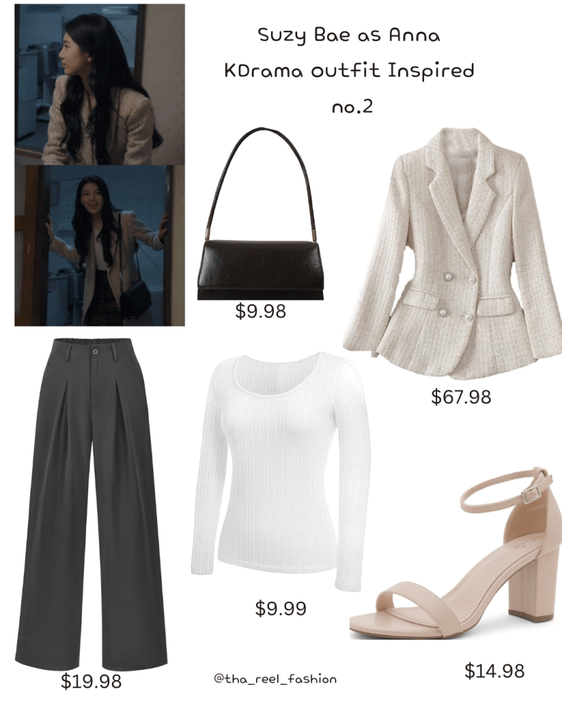 This effortlessly chic ensemble is not only stylish but also incredibly accessible. You can find all these pieces on Amazon, making it easier than ever to recreate this K-Drama-inspired look. The black structured purse is available for $9.98, the cream double-breasted blazer for $67.98, the gray wide-leg pleated pants for $19.98, the white ribbed knit top for $9.99, and the light beige ankle strap sandals for $14.98. Whether you’re dressing up for a special occasion or curating an everyday outfit with a touch of elegance, these pieces make it simple to achieve this modern, minimalist look. Perfect style, all at an amazing price—only on Amazon.