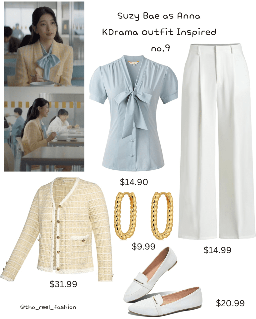 Each piece of the ensemble is priced individually for easy access: The baby blue blouse is $14.90, the wide-leg white pants are $14.99, the cream/yellow tweed cardigan is $31.99, the gold braided hoop earrings are $9.99, and the white loafers with buckle detail are $20.99. The soft pastel tones of the blouse, cardigan, and loafers create a cohesive and visually appealing palette, while the gold earrings tie it all together with a sophisticated touch. This look offers an effortlessly elevated style, perfect for anyone seeking a refined yet approachable aesthetic, all available for purchase with just a click on Amazon.